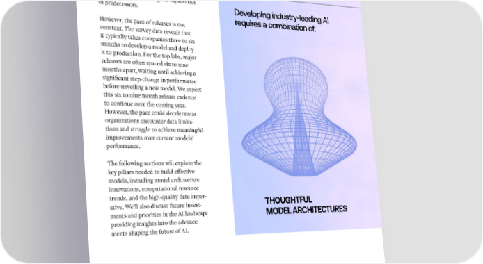 The key pillars of The race between leaders like OpenAI, Anthropic, Google, Meta, and others is eective AI models driving the rapid advancement of foun- dation models. Each lab is pushing the boundaries of what’s possible, releasing new models that leapfrog the capabilities of predecessors. Developing industry-leading AI requires a combination of: However, the pace of releases is not constant. The survey data reveals that it typically takes companies three to six months to develop a model and deploy it to production. For the top labs, major releases are often spaced six to nine months apart, waiting until achieving a significant step-change in performance before unveiling a new model. We expect this six to nine month release cadence to continue over the coming year. However, the pace could decelerate as organizations encounter data limita- tions and struggle to achieve meaningful improvements over current models’ performance. The following sections will explore the key pillars needed to build effective models, including model architecture innovations, computational resource trends, and the high-quality data imper- ative. We’ll also discuss future invest- THOUGHTFUL VAST COMPUTATIONAL CAREFULLY ments and priorities in the AI landscape MODEL ARCHITECTURES RESOURCES CURATED DATASETS providing insights into the advance- ments shaping the future of AI. ChatGPT Galactica InstructGPT Bard Timeline of Model Releases Imagen Claude 1 DALL-E-2 LLaMA GPT-4 PaLM OPT-175B Claude 2 Meta Open AI Google Anthropic Codey Whisper Claude 3 Constitutional AI Minerva PaLM-SayCan Segment Anything BlenderBot DALL-E CODEX Med-PaLM PaLM 2 BERT GPT-2 RoBERTa GPT-3 CLIP Gemini Claude Instant 2019 2020 2021 2022 2023 2024 28 29