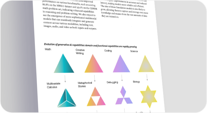 Wht to Expect in 2024 Increasingly Capable Foundation Models Expert Insight Will Power Performance Evolving Proof-of-Concepts to Scaling Improvements Production Deployments In the coming year, we expect notable advancements As researchers continue to refine these models, we can in generative AI foundation models to continue. also anticipate improvements in accuracy and reduced Human experts will play an increasingly crucial role in Improvements in model performance and capabilities Models like Claude 3 have demonstrated improved latency, making models more reliable and efficient. model advancements and evaluation. As models start will motivate leaders to quickly iterate from proof-of- performance on various benchmarks, such as scoring The size of these foundation models is also likely to to exhaust the corpus of general information widely concepts to pilots to production deployments. More 86.8% on the MMLU dataset and 95.0% on the GSM8K grow, allowing them to capture and leverage even more available on the internet, models will require addi- user friendly RAG and fine-tuning solutions will emerge math problem set, indicating enhanced capabilities knowledge and nuance from the vast amounts of data tional data to improve their capabilities. While some as on-ramps to improve adoption so that organizations in reasoning and problem-solving. We also expect to they are trained on. organizations may look to replace human-generated can more easily customize models. As start up costs see the emergence of more sophisticated multimodal data with synthetic data for training, models reliant on taper, model effectiveness improves, and more robust models that can seamlessly integrate and generate synthetic data can be susceptible to model collapse. A evaluation strategies emerge, organizations will be able content across various modalities, including text, hybrid human and synthetic data approach can mitigate to more clearly capture and define return on invest- images, audio, and video as both inputs and outputs. biases from synthetic data and still reflect nuanced ment. human preferences. The domain-specific knowledge of experts allows them to provide data that captures the Increasing Emphasis on Test & Evaluation nuance, complexity, and diversity to supplement model Practices training. Experts are also critical for testing and eval- Evolution of generative AI capabilities: domain and functional capabilities are rapidly growing uation alongside reinforcement learning from human Nearly every major model release usurps a different Math Creative Coding Science feedback, with the knowledge to identify subtle errors, leading model on various benchmarks. Enterprises Writing inconsistencies, or biases in order to provide reliable will want to create their own evaluation methodology guidance to preferred model outputs. consisting of industry benchmarks, automated model metrics, and measures for return on investment to While experts are necessary to improve model capabili- continuously evaluate their preferred model. As model ties, we anticipate organizations defining new roles that capabilities grow, model builders will place more are centered around generative AI. Prompt engineers, importance on guardrails, steerability, safety, security, machine learning researchers, and generative AI and transparency. Public sector institutions now must experts will collaborate with subject matter experts to consider the White House’s OMB Policy and test and ensure AI initiatives are successful. Generative AI will evaluate AI systems to ensure that AI is safe. Multivariate Metaphorical Debugging Biology fundamentally change the nature of work. Calculus Stories Applying Lyrical Code Genetic Gradient Sonnets Optimization Expression Theorem 10 11