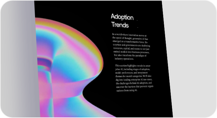 Apply AI Adoption Trends In a world where innovation moves at the speed of thought, generative AI has emerged as a transformative force. En- terprises and governments are deploying resources, capital, and teams to not just embed models into business processes, but also transform the paradigm of industry operations. This section highlights trends in enter- prise AI, including stages of adoption, model preferences, and investment themes for model categories. We’ll also dig into leading enterprise AI use-cases, the challenges behind AI adoption, and uncover the barriers that prevent organi- zations from using AI. 1212 1313