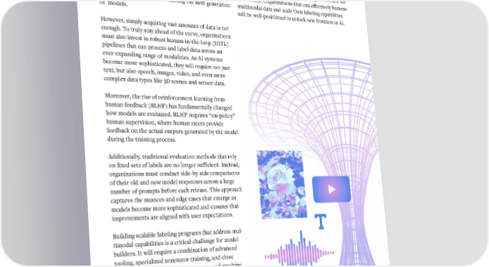 One new notable trend is the acquisition of proprietary By fusing diverse input modalities and investing in hu- data from platforms like Reddit, as exemplified by the man-in-the-loop pipelines, models can develop richer, recent multi-year data partnership between Reddit and more contextual representations that mirror how HUMAN Google. This deal, reportedly valued at $60 million humans process information and engage with their en- FEEDBACK per year, emphasizes the value placed on unique, hu- vironments. Organizations that can effectively harness man-generated content for training the next generation multimodal data and scale their labeling capabilities of models. will be well-positioned to unlock new frontiers in AI. However, simply acquiring vast amounts of data is not enough. To truly stay ahead of the curve, organizations must also invest in robust human-in-the-loop (HITL) DATA pipelines that can process and label data across an Data Flywheelever-expanding range of modalities. As AI systems become more sophisticated, they will require not just text, but also speech, images, video, and even more complex data types like 3D scenes and sensor data. Moreover, the rise of reinforcement learning from human feedback (RLHF) has fundamentally changed MODEL TRAINING how models are evaluated. RLHF requires “on-policy” & OUTPUT human supervision, where human raters provide feedback on the actual outputs generated by the model during the training process. Additionally, traditional evaluation methods that rely on fixed sets of labels are no longer sufficient. Instead, organizations must conduct side-by-side comparisons of their old and new model responses across a large number of prompts before each release. This approach captures the nuances and edge cases that emerge as The demand for specific types of Scale’s Data Streams Going forward, we expect to see increased adoption models become more sophisticated and ensures that provides insights into the priorities and use cases of human-in-the-loop pipelines that leverage subject improvements are aligned with user expectations. driving AI development. Among the most sought-after matter experts to refine model outputs and provide Data Streams are:targeted feedback. This creates a virtuous “data Building scalable labeling programs that address mul- flywheel” effect, where model usage results in new timodal capabilities is a critical challenge for model 1. Coding, Reasoning, and Precise Instruction Followinghigh-quality training data for continuous improvement.builders. It will require a combination of advanced tooling, specialized annotator training, and close 2. LanguagesMultimodal data collection spanning text, speech, collaboration between domain experts and machine images, and video will also be a key priority as organiza-learning teams. Managed labeling services with 3. Multimodal Datations seek to build AI systems that can perceive, reason expertise across a wide range of modalities will be and interact more naturally.increasingly sought after to help organizations navigate this complex landscape. 34 35