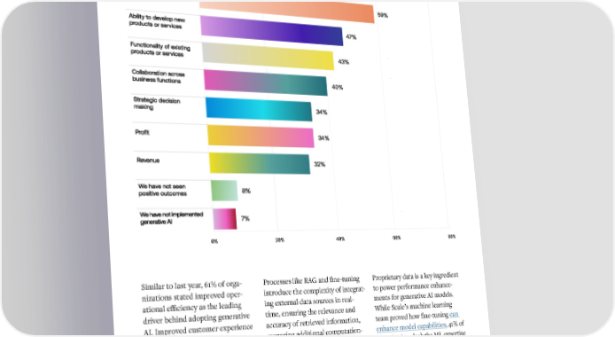 How do you work with generative AI models?What positive outcomes have you seen from generative AI adoption? Model preferences continue to usage of closed-source models Similar to last year, 61% of orga-Processes like RAG and fine-tuning Proprietary data is a key ingredient evolve and remain a key decision easier. Many closed-source models nizations stated improved oper-introduce the complexity of integrat-to power performance enhance- for an organization’s AI strategy. also outperform open source ational efficiency as the leading ing external data sources in real-ments for generative AI models. The largest increase in usage came models out-of-the-box. Despite driver behind adopting generative time, ensuring the relevance and While Scale’s machine learning from closed-source models with that, open-source model usage still AI. Improved customer experience accuracy of retrieved information, team proved how fine-tuning can 86% of organizations using these increased from 41% to 66%. This is came in second at 55%. managing additional computation-enhance model capabilities, 41% of models compared to 37% the year likely due to the flexibility open-al costs, and addressing potential organizations lack the ML expertise prior. This is likely due to a combi-source models provide for fine-tun-Despite growing adoption, there are biases or errors. Fine-tuning requires to execute the data transformations nation of factors. Many organiza-ing and hosting. The smallest still a number of challenges that stall careful selection of data to avoid and measure and evaluate results to tions have existing contracts with change in model preferences were widespread use of generative AI. 61% overfitting and ensuring models justify the initial investment. cloud service providers who in turn organizations that trained their of respondents cited infrastructure, remain generalizable to new, unseen have partnerships with closed-own models at 24% in 2024.tooling, or out-of-the-box solutions information. source model developers, making not meeting their specific needs. 08 09