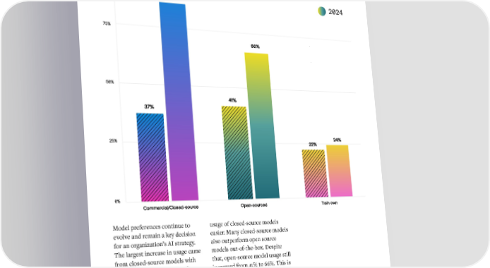How do you work with generative AI models? What positive outcomes have you seen from generative AI adoption? Model preferences continue to usage of closed-source models Similar to last year, 61% of orga- Processes like RAG and fine-tuning Proprietary data is a key ingredient evolve and remain a key decision easier. Many closed-source models nizations stated improved oper- introduce the complexity of integrat- to power performance enhance- for an organization’s AI strategy. also outperform open source ational efficiency as the leading ing external data sources in real- ments for generative AI models. The largest increase in usage came models out-of-the-box. Despite driver behind adopting generative time, ensuring the relevance and While Scale’s machine learning from closed-source models with that, open-source model usage still AI. Improved customer experience accuracy of retrieved information, team proved how fine-tuning can 86% of organizations using these increased from 41% to 66%. This is came in second at 55%. managing additional computation- enhance model capabilities, 41% of models compared to 37% the year likely due to the flexibility open- al costs, and addressing potential organizations lack the ML expertise prior. This is likely due to a combi- source models provide for fine-tun- Despite growing adoption, there are biases or errors. Fine-tuning requires to execute the data transformations nation of factors. Many organiza- ing and hosting. The smallest still a number of challenges that stall careful selection of data to avoid and measure and evaluate results to tions have existing contracts with change in model preferences were widespread use of generative AI. 61% overfitting and ensuring models justify the initial investment. cloud service providers who in turn organizations that trained their of respondents cited infrastructure, remain generalizable to new, unseen have partnerships with closed- own models at 24% in 2024. tooling, or out-of-the-box solutions information. source model developers, making not meeting their specific needs. 08 09