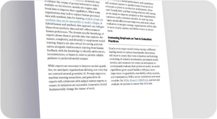 Wht to Expect in 2024 Increasingly Capable Foundation ModelsExpert Insight Will Power Performance Evolving Proof-of-Concepts to Scaling Improvements Production Deployments In the coming year, we expect notable advancements As researchers continue to refine these models, we can in generative AI foundation models to continue. also anticipate improvements in accuracy and reduced Human experts will play an increasingly crucial role in Improvements in model performance and capabilities Models like Claude 3 have demonstrated improved latency, making models more reliable and efficient. model advancements and evaluation. As models start will motivate leaders to quickly iterate from proof-of- performance on various benchmarks, such as scoring The size of these foundation models is also likely to to exhaust the corpus of general information widely concepts to pilots to production deployments. More 86.8% on the MMLU dataset and 95.0% on the GSM8K grow, allowing them to capture and leverage even more available on the internet, models will require addi-user friendly RAG and fine-tuning solutions will emerge math problem set, indicating enhanced capabilities knowledge and nuance from the vast amounts of data tional data to improve their capabilities. While some as on-ramps to improve adoption so that organizations in reasoning and problem-solving. We also expect to they are trained on. organizations may look to replace human-generated can more easily customize models. As start up costs see the emergence of more sophisticated multimodal data with synthetic data for training, models reliant on taper, model effectiveness improves, and more robust models that can seamlessly integrate and generate synthetic data can be susceptible to model collapse. A evaluation strategies emerge, organizations will be able content across various modalities, including text, hybrid human and synthetic data approach can mitigate to more clearly capture and define return on invest- images, audio, and video as both inputs and outputs. biases from synthetic data and still reflect nuanced ment. human preferences. The domain-specific knowledge of experts allows them to provide data that captures the Increasing Emphasis on Test & Evaluation nuance, complexity, and diversity to supplement model Practices training. Experts are also critical for testing and eval- Evolution of generative AI capabilities: domain and functional capabilities are rapidly growinguation alongside reinforcement learning from human Nearly every major model release usurps a different MathCreative CodingSciencefeedback, with the knowledge to identify subtle errors, leading model on various benchmarks. Enterprises Writing inconsistencies, or biases in order to provide reliable will want to create their own evaluation methodology guidance to preferred model outputs. consisting of industry benchmarks, automated model metrics, and measures for return on investment to While experts are necessary to improve model capabili- continuously evaluate their preferred model. As model ties, we anticipate organizations defining new roles that capabilities grow, model builders will place more are centered around generative AI. Prompt engineers, importance on guardrails, steerability, safety, security, machine learning researchers, and generative AI and transparency. Public sector institutions now must experts will collaborate with subject matter experts to consider the White House’s OMB Policy and test and ensure AI initiatives are successful. Generative AI will evaluate AI systems to ensure that AI is safe. Multivariate Metaphorical DebuggingBiologyfundamentally change the nature of work. CalculusStories Applying Lyrical Code Genetic Gradient SonnetsOptimizationExpression Theorem 10 11