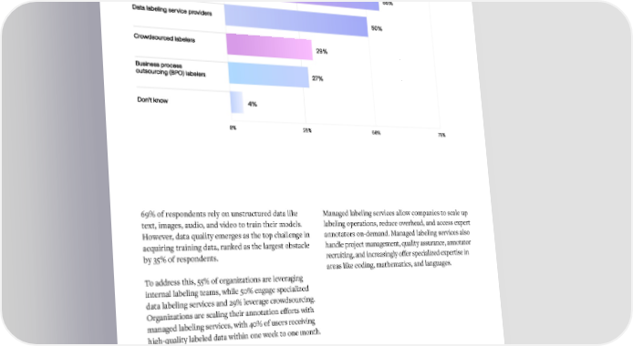 Unlocking AI Potential: Domin-Specific, Future Investments & Priorities Humn-Generted Dtsets Common approaches for data annotation. Top challenges in preparing high-quality training data for AI models. Data is the fuel that powers AI models, and the question answering, coding, and agentic use cases, ad-69% of respondents rely on unstructured data like Managed labeling services allow companies to scale up quality, quantity, and diversity of that data is critical to vancements in AI capabilities will be bottlenecked by the text, images, audio, and video to train their models. labeling operations, reduce overhead, and access expert building effective, unbiased systems. The survey results supervision we can feed into these models.However, data quality emerges as the top challenge in annotators on-demand. Managed labeling services also highlight the importance of high-quality datasets, with acquiring training data, ranked as the largest obstacle handle project management, quality assurance, annotator labeling quality as the top challenge in preparing data Even if you train long enough with enough GPUs, you’ll by 35% of respondents.recruiting, and increasingly offer specialized expertise in for training models. Obtaining extremely high-quality get similar results with any modern model. It’s not about areas like coding, mathematics, and languages. labels while minimizing the time required to get that the model, it’s about the data that it was trained with. The To address this, 55% of organizations are leveraging labeled data is a significant hurdle for model builders. difference between performance is the volume and quality of internal labeling teams, while 50% engage specialized This highlights the need for efficient data labeling data, especially human feedback data. You absolutely need data labeling services and 29% leverage crowdsourcing. processes and tools that can maintain high standards it. That will determine your success. Organizations are scaling their annotation efforts with while expediting the labeling process.- Ashiqur Rahman, Machine Learning Researcher, managed labeling services, with 40% of users receiving Kimberly-Clarkhigh-quality labeled data within one week to one month. Large, web-scraped datasets have been instrumental in pre-training foundation models. The next leap in Human-labeled data plays a critical role in aligning models capabilities will require more targeted, domain-specific with user preferences and real-world requirements. data that captures the nuances and edge cases that only Techniques like reinforcement learning from human human experts can provide.The advent of generative AI feedback (RLHF) can help guide models towards desired and large language models (LLMs) has fundamentally behaviors and outputs, but they require a steady stream of changed what it means to create high-quality training high-quality, human-generated labels and rankings. and evaluation data. For open-ended use cases, such as 32 33