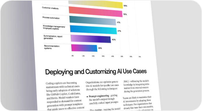 How does your company plan on investing in generative AI over the next 3 years?In which ways has your company implemented AI? Model Investment Deploying nd Customizing AI Use Cses Just as the leading preferred models leading commercial closed-source improved operational efficiency Coding copilots are becoming Organizations can optimize genera-(RAG) - enhancing the model’s are closed-source commercial models are closely tied to leading is the key driver behind adopting mainstream with technical users tive AI models for specific use cases knowledge by integrating infor- models, planned investments in cloud-service providers. Enter-generative AI. Generative AI use being early adopters of solutions through the following techniques:mation from external sources these categories of models reflect prises can draw down from cloud cases reflect this shift in priorities. like GitHub Copilot, CodeLlama, during the generation process. usage trends. 72% of organizations spend commitments through use of The leading use-cases for generative and Devin. Model vendors have • Prompt-engineering - guiding plan to increase investments in partner models (e.g., Amazon and AI adoption are computer program-responded to demand for content the model’s output through Teams are likely to maximize their commercial closed-source models. Anthropic, Microsoft and Open AI). ming and content generation..generation with prompt templates carefully crafted input promptsAI investments by adopting these A lower percentage of organiza-that guide users to effective content techniques. For organizations that tions plan to invest in open-source Last year, organizations referenced creation questions for functions • Fine-tuning - training the model already fine-tune their own models, models at 67%. While open-the ability to develop new products including Marketing, Product Man-on domain-specific data39% saw improved performance on source models provide organiza-or services as the leading reason agement, and Public Relations.domain-specific tasks compared to tions with greater control, many to adopt generative AI. This year, • Retrieval-Augmented Generation out-of-the-box models. 18 19