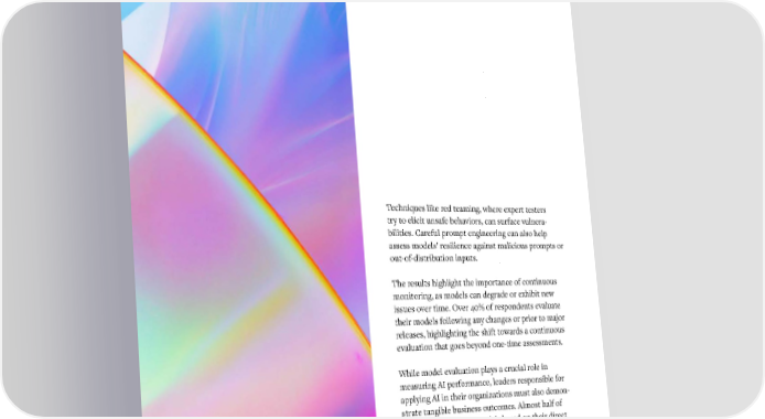 Techniques like red teaming, where expert testers try to elicit unsafe behaviors, can surface vulnera- bilities. Careful prompt engineering can also help assess models’ resilience against malicious prompts or out-of-distribution inputs. The results highlight the importance of continuous monitoring, as models can degrade or exhibit new issues over time. Over 40% of respondents evaluate their models following any changes or prior to major releases, highlighting the shift towards a continuous evaluation that goes beyond one-time assessments. While model evaluation plays a crucial role in measuring AI performance, leaders responsible for applying AI in their organizations must also demon- strate tangible business outcomes. Almost half of respondents evaluate models based on their direct impact on KPIs like operational efficiency or customer satisfaction. Grounding evaluations in downstream outcomes ensures that models are not just technically proficient but actually valuable in practice. 40 41