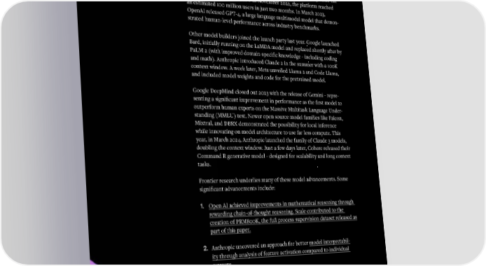 Genertive AI continues to reshpe our world Advancements in generative AI continued to accelerate in 2023. After the release of OpenAI’s ChatGPT in November 2022, the platform reached an estimated 100 million users in just two months. In March 2023, OpenAI released GPT-4, a large language multimodal model that demon- strated human-level performance across industry benchmarks. Other model builders joined the launch party last year. Google launched Bard, initially running on the LaMDA model and replaced shortly after by PaLM 2 (with improved domain-specific knowledge - including coding Yer in and math). Anthropic introduced Claude 2 in the summer with a 100K context window. A week later, Meta unveiled Llama 2 and Code Llama, and included model weights and code for the pretrained model. Google DeepMind closed out 2023 with the release of Gemini - repre- senting a significant improvement in performance as the first model to outperform human experts on the Massive Multitask Language Under- Review standing (MMLU) test. Newer open source model families like Falcon, Mixtral, and DBRX demonstrated the possibility for local inference while innovating on model architecture to use far less compute. This year, in March 2024, Anthropic launched the family of Claude 3 models, doubling the context window. Just a few days later, Cohere released their Command R generative model - designed for scalability and long context tasks. Frontier research underlies many of these model advancements. Some significant advancements include: 1. Open AI achieved improvements in mathematical reasoning through rewarding chain-of-thought reasoning. Scale contributed to the creation of PRM800K, the full process supervision dataset released as part of this paper. 2. Anthropic uncovered an approach for better model interpretabil- ity through analysis of feature activation compared to individual neurons. 3. The Microsoft Research team discovered that a model with a smaller number of parameters relative to state-of-the-art models can demon- strate impressive performance on task-specific benchmarks when fine-tuned with high-quality textbook data. 04 05